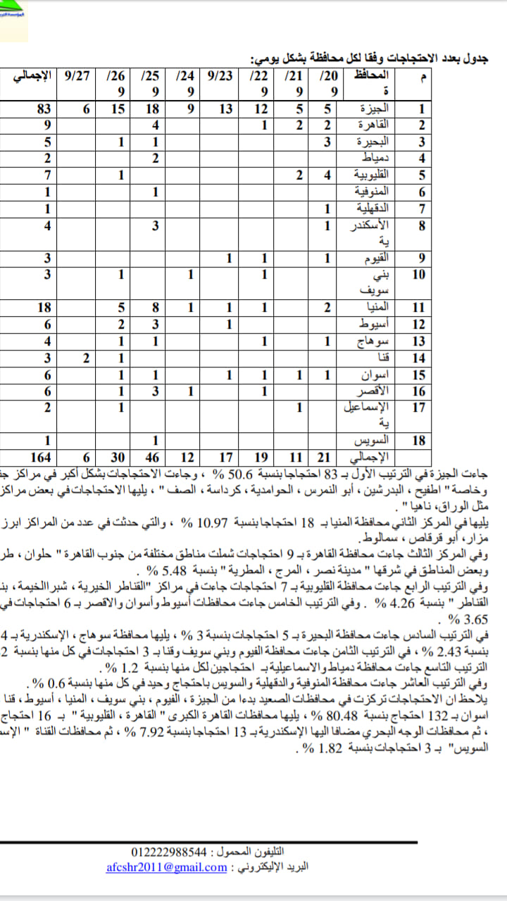 رصد تقرير المؤسسة العربية لدعم المجتمع المدني وحقوق الإنسان حول احتجاجات سبتمبر الجارى، 164 احتجاجا في 8 أيام اعلاها في الجيزة بـ 83 احتجاجا والمنيا بـ 18  احتجاجا.
