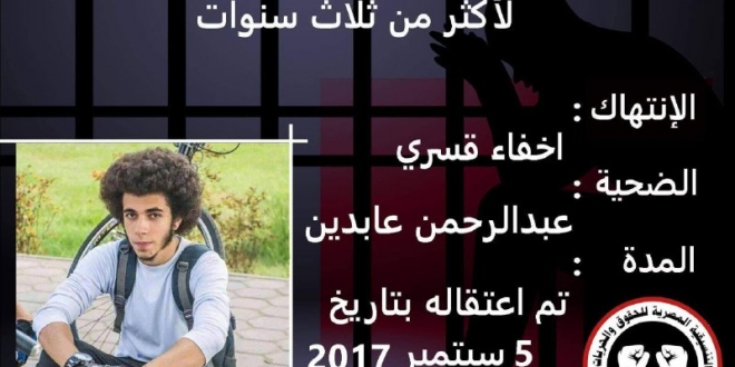 ووثقت "التنسيقية المصرية للحقوق والحريات" استمرار الإخفاء القسري للطالب عبدالرحمن عابدين لأكثر من 3 سنوات ضمن مسلسل جرائم نظام الانقلاب.