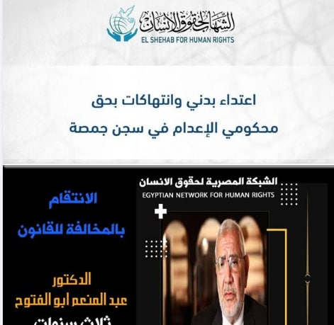 إلى ذلك وثق "مركز الشهاب لحقوق الإنسان" اعتداء رئيس مباحث سجن جمصة شديد الحراسة على عدد من المحكوم عليهم بالإعدام بالضرب والتعذيب، وذلك يوم 7 من الشهر الجاري. وأكد أن إدارة السجن رفضت علاج المصابين أو عمل تقرير طبي بحالتهم للحيلولة دون شكوى المصابين رسميا، رغم وجود إصابات في أماكن متفرقة بالجسم؛ دون علاج أو مراعاة لحقوقهم القانونية والإنسانية.