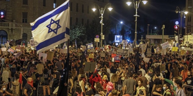 Protesters gather for a demonstration against the Israeli government near the Prime Minister's residence in Jerusalem on July 25, 2020. (Photo by AHMAD GHARABLI / AFP)