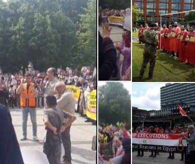 وفي بريطانيا نظم عدد من الاحرار مجموعة من الفعاليات رفضا لأحكام الاعدام المسيسة بهزلية مذبحة رابعة العدوية وغيرها، الفعاليات شملت معرضا مصورا ووقفة احتجاجية شهدت ترديد الهتافات والشعارات الرافضة للظلم والمطالبة بوقف تنفيذ أحكام الاعدامات وإطلاق الحريات ووقف التنكيل بمناهضي النظام الانقلابي.