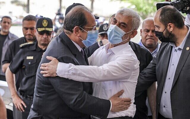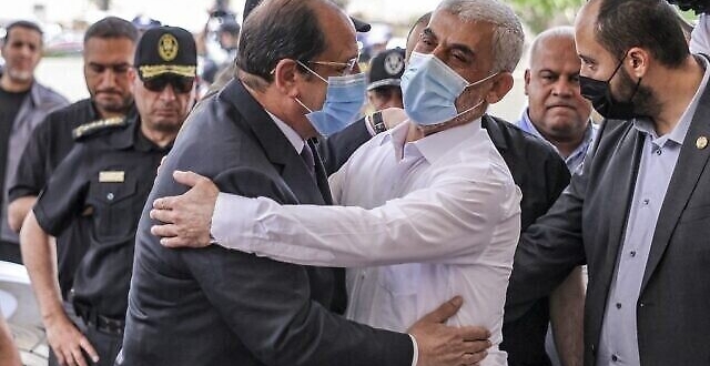 Yahya Sinwar (L), Hamas' political chief in Gaza, embraces General Abbas Kamel (R), Egypt's intelligence chief, as the latter arrives for a meeting with leaders of Hamas in Gaza City on May 31, 2021. (Photo by MAHMUD HAMS / AFP)