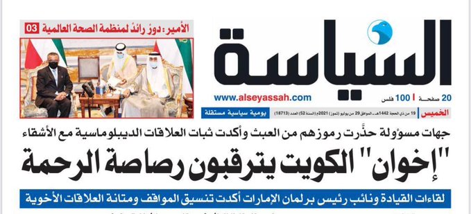 وبالتزامن مع تكثيف الأذرع الإماراتية، هجومها على إخوان الكويت والحديث عن أن "الدور عليهم بعد إخوان تونس"، نشرت صحيفة "السياسة" الكويتية 28 يوليو/ تموز 2021 مانشيت تحريضي يقول "إخوان الكويت يترقبون رصاصة الرحمة".