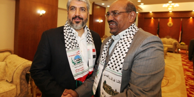 RESTRICTED TO EDITORIAL USE - MANDATORY CREDIT "AFP PHOTO / HO / HAMAS" NO MARKETING NO ADVERTISING CAMPAIGNS - DISTRIBUTED AS A SERVICE TO CLIENTS--- A handout picture released by the Hamas movement on March 6, 2011, shows Exiled Hamas chief Khaled Meshaal shaking hands with Sudanese President Omar al-Beshir (R) at the opening of the eighth Al-Quds (Jerusalem) International Foundation conference in the Sudanese capital Khartoum, where he hailed the sweeping political changes in Egypt, which he said had given the Palestinian people their lives back. AFP PHOTO/HO/HAMAS (Photo by - / HAMAS PRESS OFFICE / AFP)