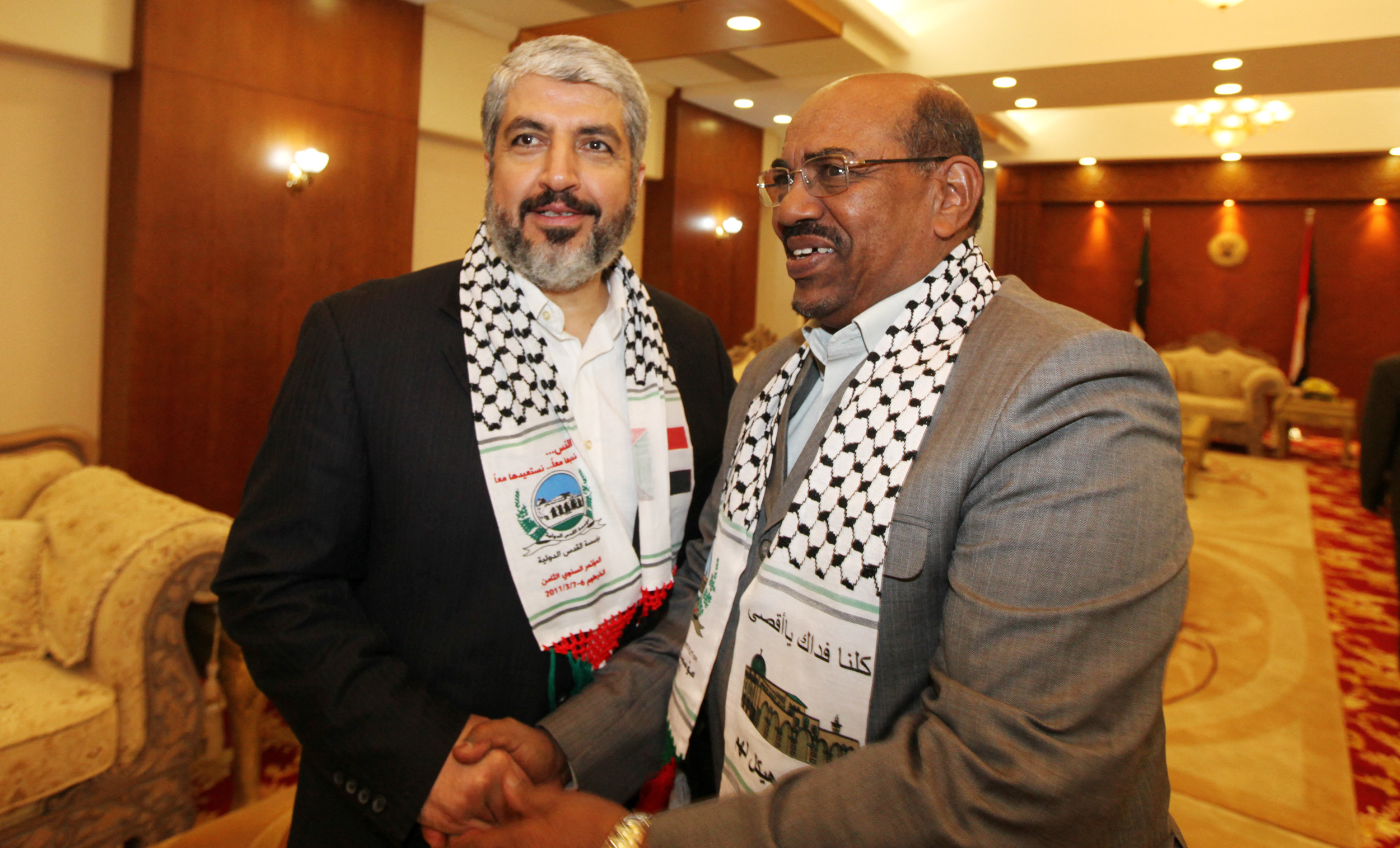 RESTRICTED TO EDITORIAL USE - MANDATORY CREDIT "AFP PHOTO / HO / HAMAS" NO MARKETING NO ADVERTISING CAMPAIGNS - DISTRIBUTED AS A SERVICE TO CLIENTS--- A handout picture released by the Hamas movement on March 6, 2011, shows Exiled Hamas chief Khaled Meshaal shaking hands with Sudanese President Omar al-Beshir (R) at the opening of the eighth Al-Quds (Jerusalem) International Foundation conference in the Sudanese capital Khartoum, where he hailed the sweeping political changes in Egypt, which he said had given the Palestinian people their lives back. AFP PHOTO/HO/HAMAS (Photo by - / HAMAS PRESS OFFICE / AFP)