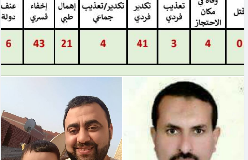 يضاف إليها 21 حالة إهمال طبي و43 حالة إخفاء قسري و 3 حالات تعذيب فردي و41 حالة تكدير جماعي و4 حالات تعذيب جماعي و6 حالة لعنف الدولة.