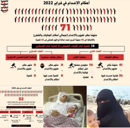 وذكرت أن أحكام الإعدام صدرت في فبراير الماضي ضد 71 شخصا بينهم 61 من محكمة الجنايات في 34 قضية و10 آخرين حصلوا على أحكام نهائية بالإعدام من محكمة النقض في 4 قضايا ، كما تم إحالة أوراق 58 مواطنا للمفتي لأخذ الرأي في إعدامهم في 30 قضية أخرى ، ولم يشهد الشهر تنفيذ أي حكم للإعدام.