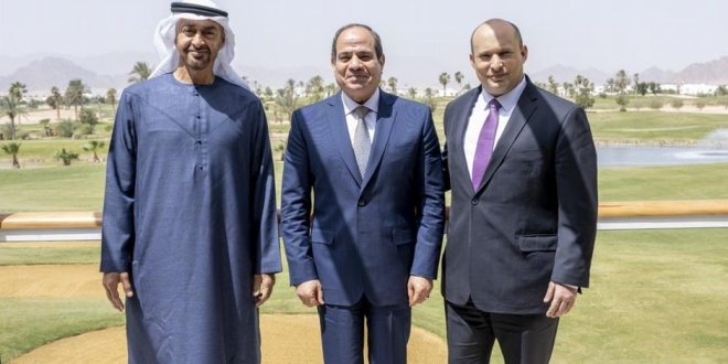 نشر موقع "تايمز أوف إسرائيل" تفاصيل اللقاء الثلاثي الذي جمع رئيس وزراء الاحتلال نفتالي بينيت وعبدالفتاح السيسي ومحمد بن زايد ولي عهد أبوظبي.