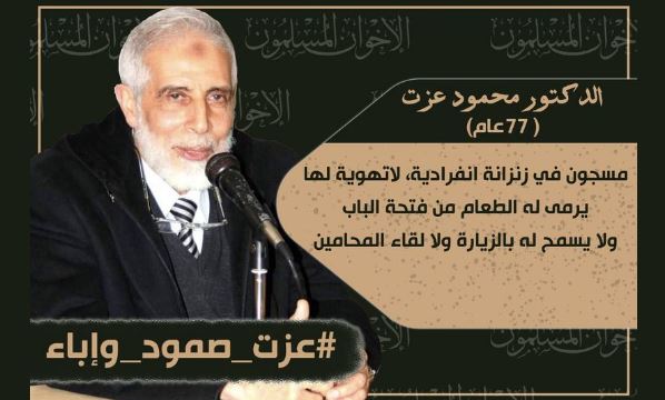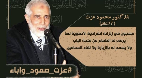 د محمود عزت ، مسجون بزنزانة فردية، لاتهوية لها، يرمى له الطعام من فتحة الباب، ولا يسمح بزيارته ولا لقاء المحامين.