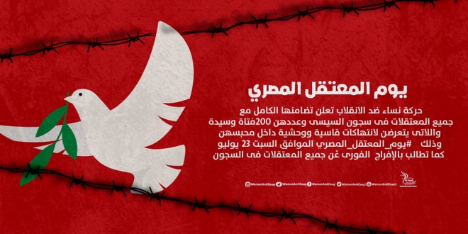 أعلنت حركة نساء ضد الانقلاب عن تضامنها مع جميع المعتقلات في سجون السيسي وعددهن 200 فتاة وسيدة بالتزامن مع يوم المعتقل الذي أطلقته رابطة شباب المعتقلين مؤخرا ، والذي يوافق السبت 23 يوليو الجاري .