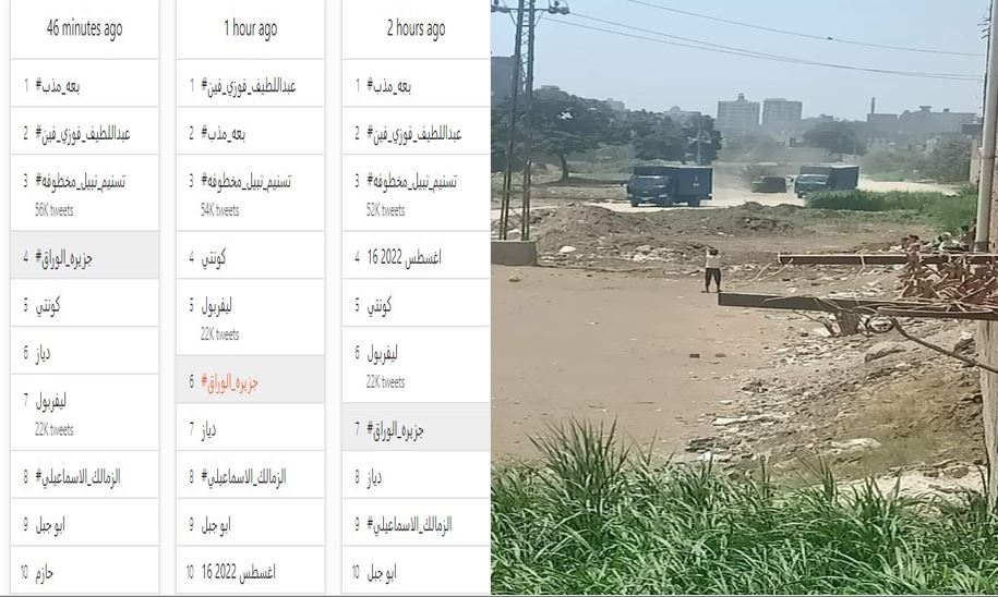 تصدر هاشتاج #جزيرة_الوراق موقع التواصل الاجتماعي للتغريدات القصيرة "تويتر" مع مشاهد جديدة لمنع مظاهرات أهالي الوراق الرافضة للتفريط ببيوتهم وأراضيهم الزراعية لصالح مشروعات إماراتية داخل مصر.