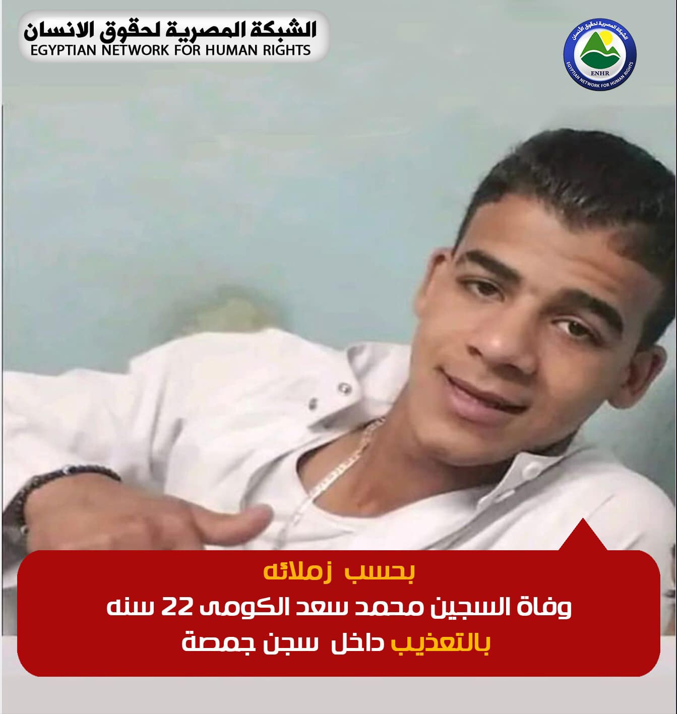 وثقت الشبكة المصرية لحقوق الإنسان وفاة المسجون "محمد سعد الدين الكومي" عن عمر 22 سنة، من منطقة شبرا بالقاهرة الكبرى، داخل محبسه بسجن جمصة شديد الحراسة.