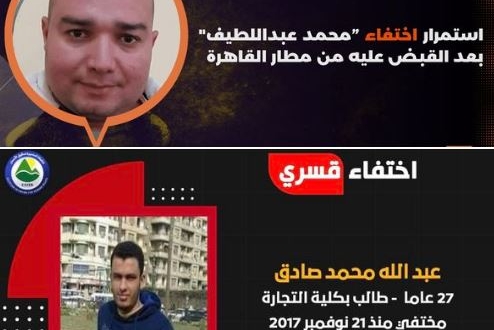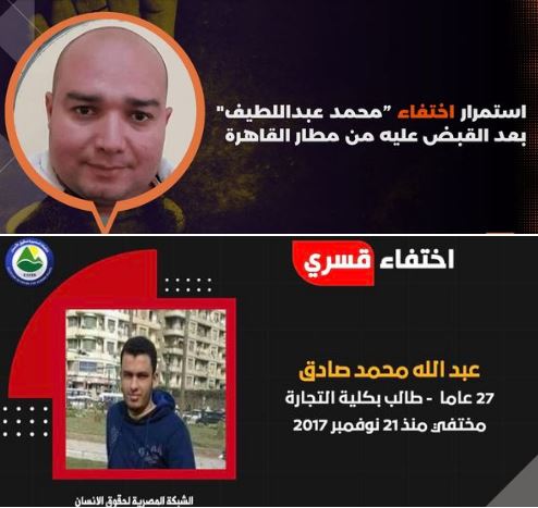 فيما وثقت الشبكة المصرية لحقوق الإنسان استمرار اختفاء " عبد الله محمد صادق" يبلغ من العمر 27 عاما، للعام الخامس على التوالي منذ اعتقاله للمرة الثانية تعسفيا يتاريخ 21 نوفمبر 2017، من قبل قوات أمن الانقلاب بني سويف أثناء وجوده بمحيط جامعة بني سويف، واقتادته إلى جهة غير معلومة، ولم يستدل على مكانه حتى اليوم.