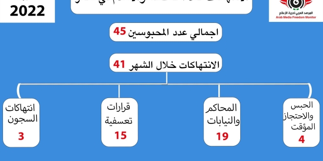 وثق المرصد العربي لحرية الإعلام في تقرير عن انتهاكات الإعلام في مصر لشهر أكتوبر المنقضي (٤١) انتهاكا، تصدرها من حيث العدد، انتهاكات المحاكم والنيابات بـ(١٩) انتهاكا، تلاها القرارات الإدارية التعسفية بـ(١٥) انتهاكا، ثم الحبس والاحتجاز المؤقت بـ(٤) انتهاكات، ثم انتهاكات السجون بـ(٣) انتهاكات مع استمرار حبس 45 صحفيا وإعلاميا بينهم 3 تم القبض عليهم مؤخرا .
