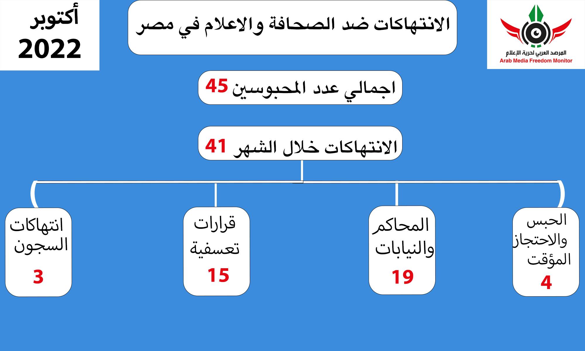 وثق المرصد العربي لحرية الإعلام في تقرير عن انتهاكات الإعلام في مصر لشهر أكتوبر المنقضي (٤١) انتهاكا، تصدرها من حيث العدد، انتهاكات المحاكم والنيابات بـ(١٩) انتهاكا، تلاها القرارات الإدارية التعسفية بـ(١٥) انتهاكا، ثم الحبس والاحتجاز المؤقت بـ(٤) انتهاكات، ثم انتهاكات السجون بـ(٣) انتهاكات مع استمرار حبس 45 صحفيا وإعلاميا بينهم 3 تم القبض عليهم مؤخرا .