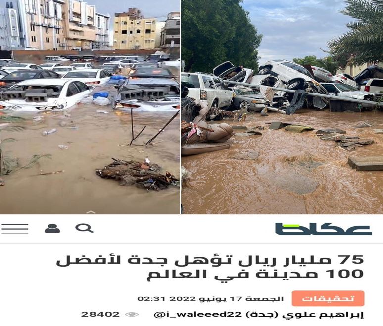 وتعليقا على تصريحات بعض المدافعين عن الفساد، وحديث أحدهم عن دور السدود الاحترازية التي تم إنشاؤها مؤخرا في حماية محافظة جدة -بعد الله- من كارثة كبرى بعد هطول الأمطار الغزيرة اليوم والتي وصلت كميتها إلى 179 ملم بينما في 2009 كانت الكمية تقريبا 90 ملم" لفت (@buhayat_22) إلى أنه "هكذا تتعامل الحكومات المستبدة الساقطة مع مواطنيها بدلا من مُساءلة ومُحاسبة المتسبب لهذه الكوارث ومن ثم اعتذاره واستقالته، تقوم كلاب السلطة الساقطة بتبرير فساده وفشله، بل وتحث المواطن على شكره ودعمه فلولاه لكانت الكارثة أكبر وأفدح ، إنها#السعودية_العظمى".