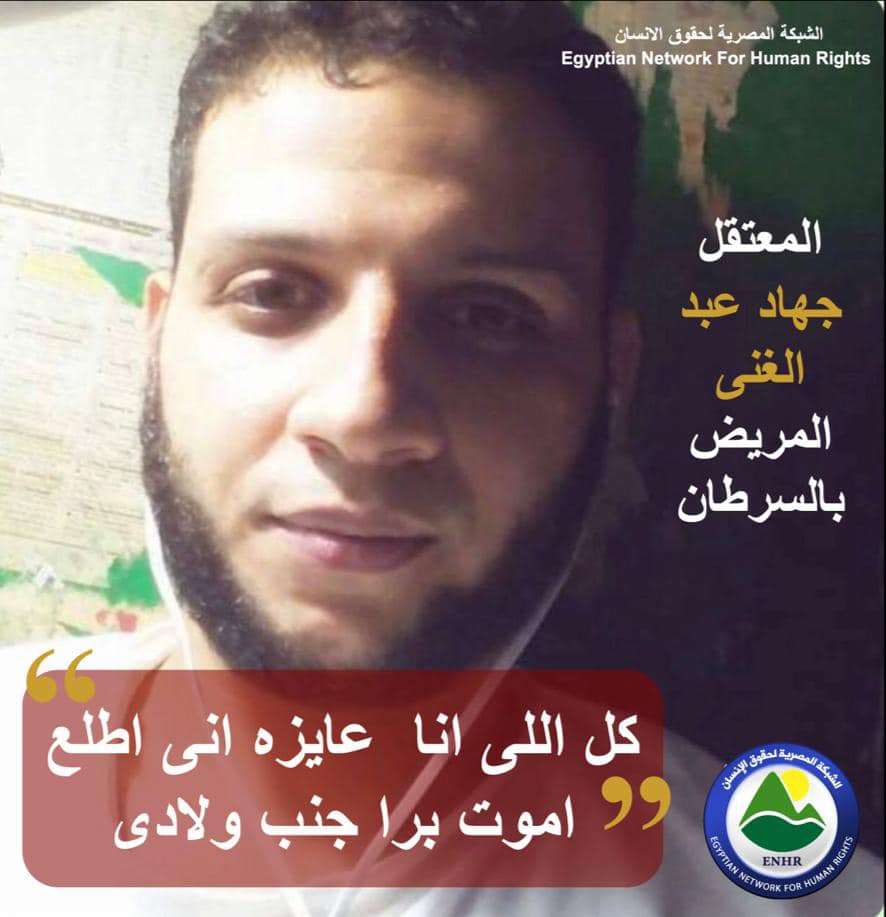 وقالت الشبكة إنها "تلقت استغاثة عاجلة من أسرة المعتقل الشاب جهاد عبد الغني محمد سليم ، 32 عاما، والمصاب بسرطان الفك والحلق، والمتواجد حاليا بالمركز الطبي بسجن بدر للاصلاح والتأهيل، وذلك بعدما فقد الأمل في الشفاء، نظرا لتدهور حالته الصحية بشكل سريع، بعد احالته منذ 4 أيام إلى قسم الرعاية المركزة بالمركز الطبي بمركز بدر للإصلاح والتاهيل".