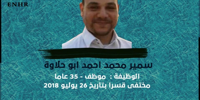 دانت “الشبكة المصرية لحقوق الإنسان” استمرار جريمة إخفاء سمير محمد أحمد أبو حلاوة منذ اعتقاله تعسفيا يوم 26 يوليو 2018 من قبل قوت أمن الانقلاب بالجيزة واقتياده لجهة غير معلومة ضمن مسلسل جرائم النظام الانقلابي التي تعد جريمة ضد الإنسانية ولا تسقط بالتقادم.