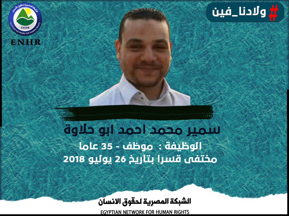 دانت “الشبكة المصرية لحقوق الإنسان” استمرار جريمة إخفاء سمير محمد أحمد أبو حلاوة منذ اعتقاله تعسفيا يوم 26 يوليو 2018 من قبل قوت أمن الانقلاب بالجيزة واقتياده لجهة غير معلومة ضمن مسلسل جرائم النظام الانقلابي التي تعد جريمة ضد الإنسانية ولا تسقط بالتقادم.