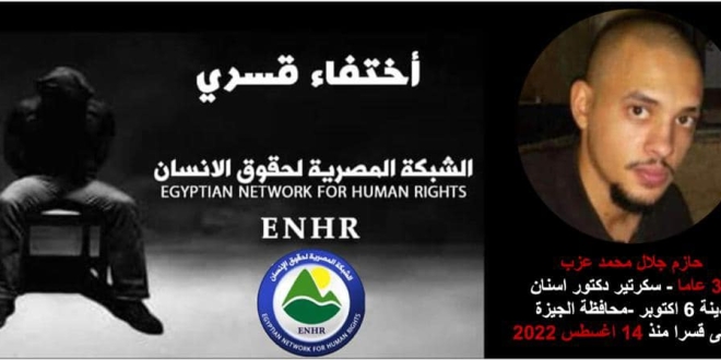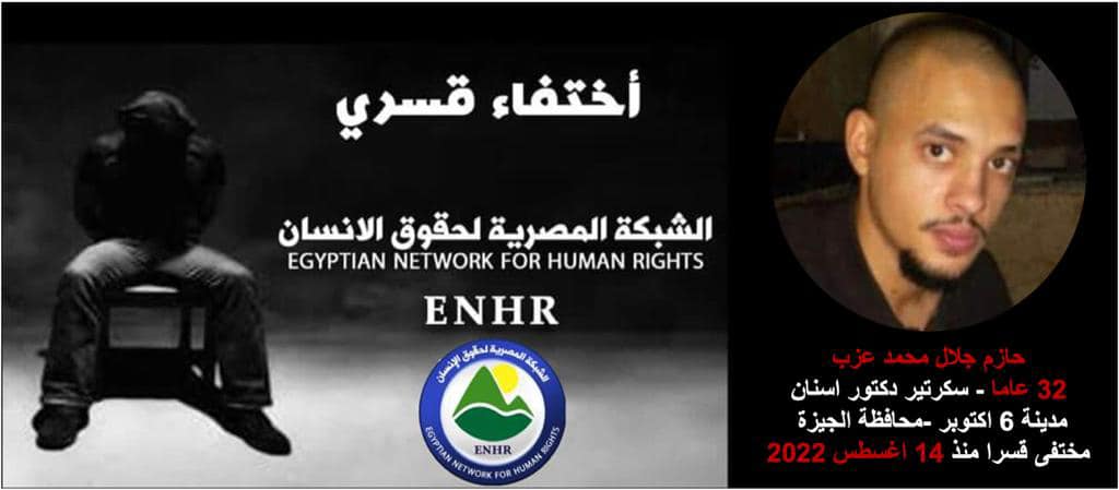 إلى ذلك وثقت "الشبكة المصرية لحقوق الإنسان" استمرار إخفاء قوات الانقلاب بمحافظة الجيزة للشاب حازم جلال محمد عزب منذ اعتقاله تعسفيا من داخل منزله بمدينة السادس من أكتوبر بتاريخ 14 أغسطس 2022 الماضي ، و اقتياده إلى جهة غير معلومة دون عرضه على أي من جهات التحقيق حتى اليوم .