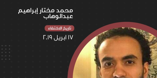 للعام الرابع على التوالي تواصل سلطات الانقلاب في مصر جريمة إخفاء الشاب ” محمد مختار إبراهيم عبدالوهاب ” منذ اعتقاله تعسفيا بتاريخ 17 أبريل 2019 واقتياده لجهة غير معلومة حتى الآن دون ذكر أسباب ذللك ضمن مسلسل جرائم نظام السيسي المنقلب التي تعكس الإصرار على انتهاكات أدنى معايير حقوق الإنسان .