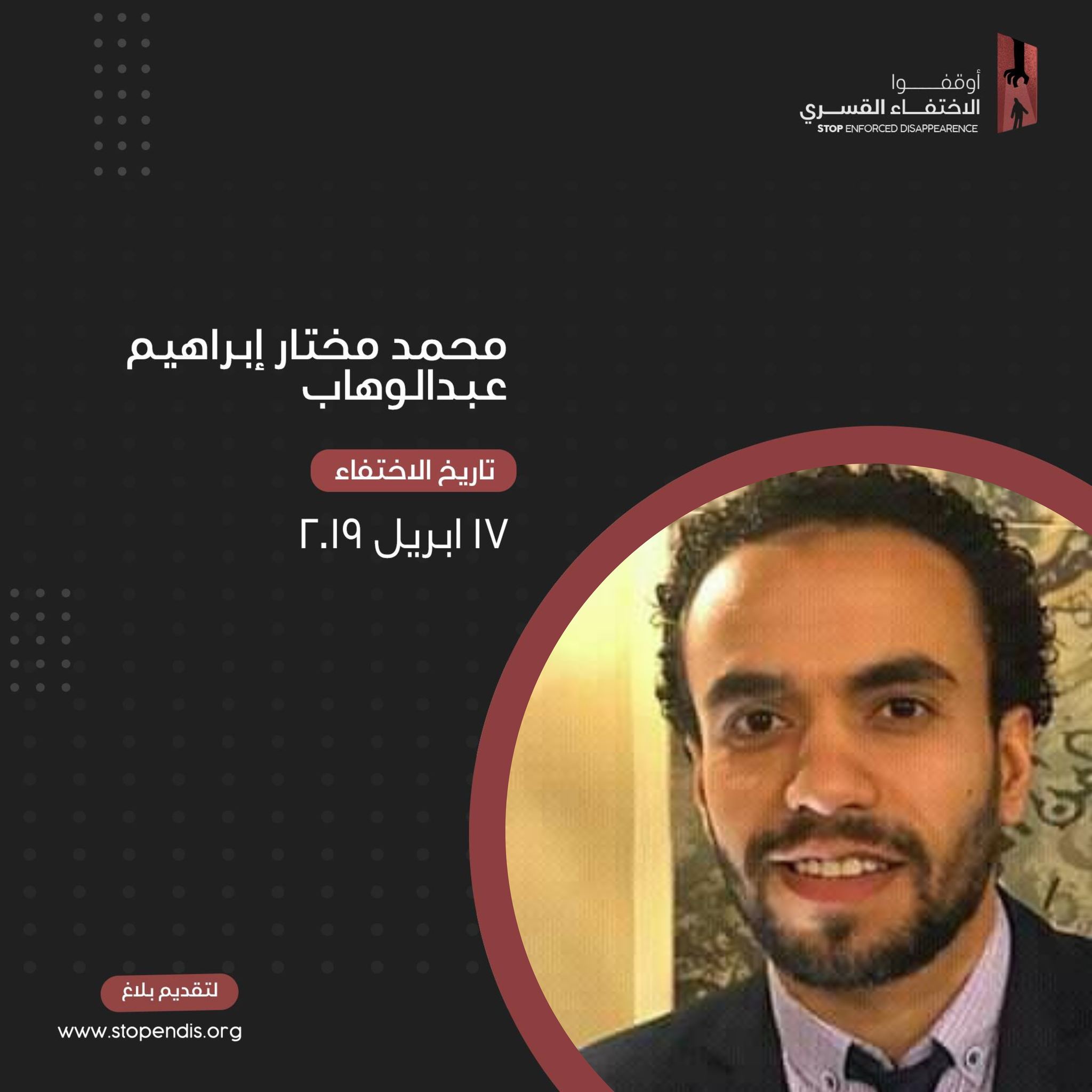 للعام الرابع على التوالي تواصل سلطات الانقلاب في مصر جريمة إخفاء الشاب ” محمد مختار إبراهيم عبدالوهاب ” منذ اعتقاله تعسفيا بتاريخ 17 أبريل 2019 واقتياده لجهة غير معلومة حتى الآن دون ذكر أسباب ذللك ضمن مسلسل جرائم نظام السيسي المنقلب التي تعكس الإصرار على انتهاكات أدنى معايير حقوق الإنسان .