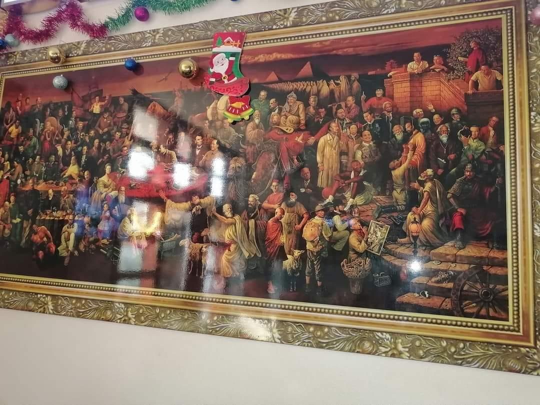 وتداول رواد مواقع التواصل الاجتماعي الصورة بكثافة، واللوحة التي تحمل اسم "مناقشة الكوميديا الإلهية مع دانتي" تضم أكثر من 100 شخصية تركت أثرا في تاريخ البشرية، وفي خلفية اللوحة آثار إنسانية تاريخية مثل الأهرامات وأحجار ستونهنج.