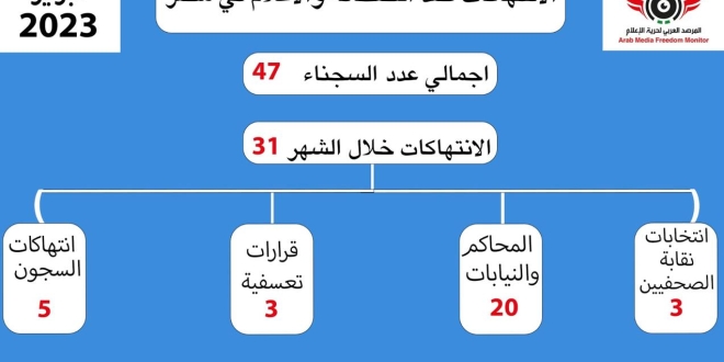 وذكر أن من أخطر الانتهاكات التي شهدها شهر فبراير المنصرم، تعرض الصحفيين ضمن الآلاف من سجناء الرأي والأزمة السياسية في سجن بدر إلى انتهاكات جسيمة ترقى إلى جرائم التعذيب، وهو ما يثير مشاعر القلق والخوف على حياتهم، ويتطلب تشكيل لجنة تقصي حقائق نقابية وحقوقية للوقوف على ما يتعرض له الصحفيون وباقي السجناء في هذا السجن، وهذا ما طالب به بيان وقّع عليه المرصد العربي لحرية الإعلام ضمن 19 منظمة حقوقية مصرية ودولية في الأسبوع الأخير للشهر المنصرم.
