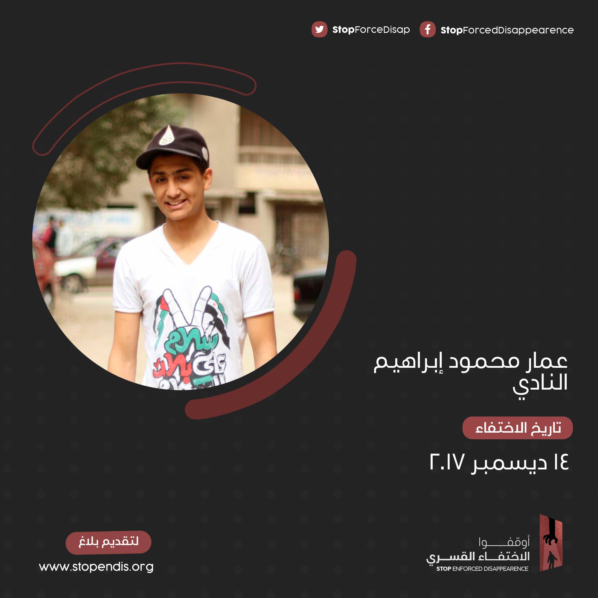 المصير المجهول ذاته يتواصل للشاب عمار محمود إبراهيم النادي، البالغ من العمر 19 عاما، وهو طالب بجامعة الزقازيق، وجددت الحملة المطالبة بالكشف عن مكان احتجازه منذ اعتقاله يوم 14 ديسمبر 2014.