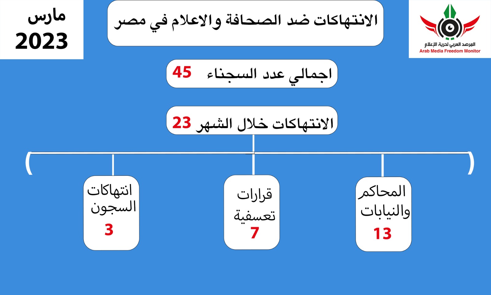 رصد المرصد العربي لحرية الإعلام (اكشف ) خلال تقريره عن انتهاكات حرية الإعلام في مصر لشهر مارس 2023 المنصرم 23 انتهاكا مع استمرار حبس 45 صحفيا وصحفية، بينهم 13 نقابيا، بعد الإفراج عن صحفيين اثنين.