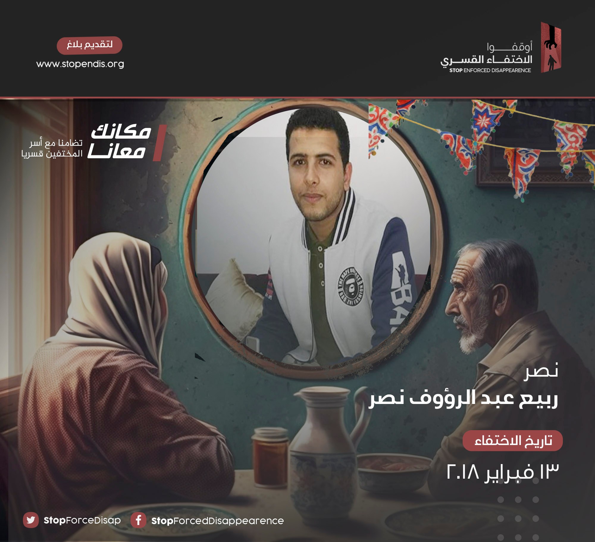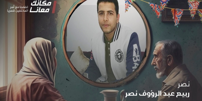 وعبر وسم #مكانك_معانا جددت حملة أوقفوا الاختفاء القسري المطالبة برفع الظلم الواقع على الشاب "نصر ربيع عبد الرؤوف نصر" الذي يقضي رمضانه السادس قيد الإختفاء القسري منذ أن تم اعتقاله بتاريخ 13فبراير2018 بعد القبض عليه من الصيدلية التي يعمل بها بحي مدينة نصر في القاهرة.