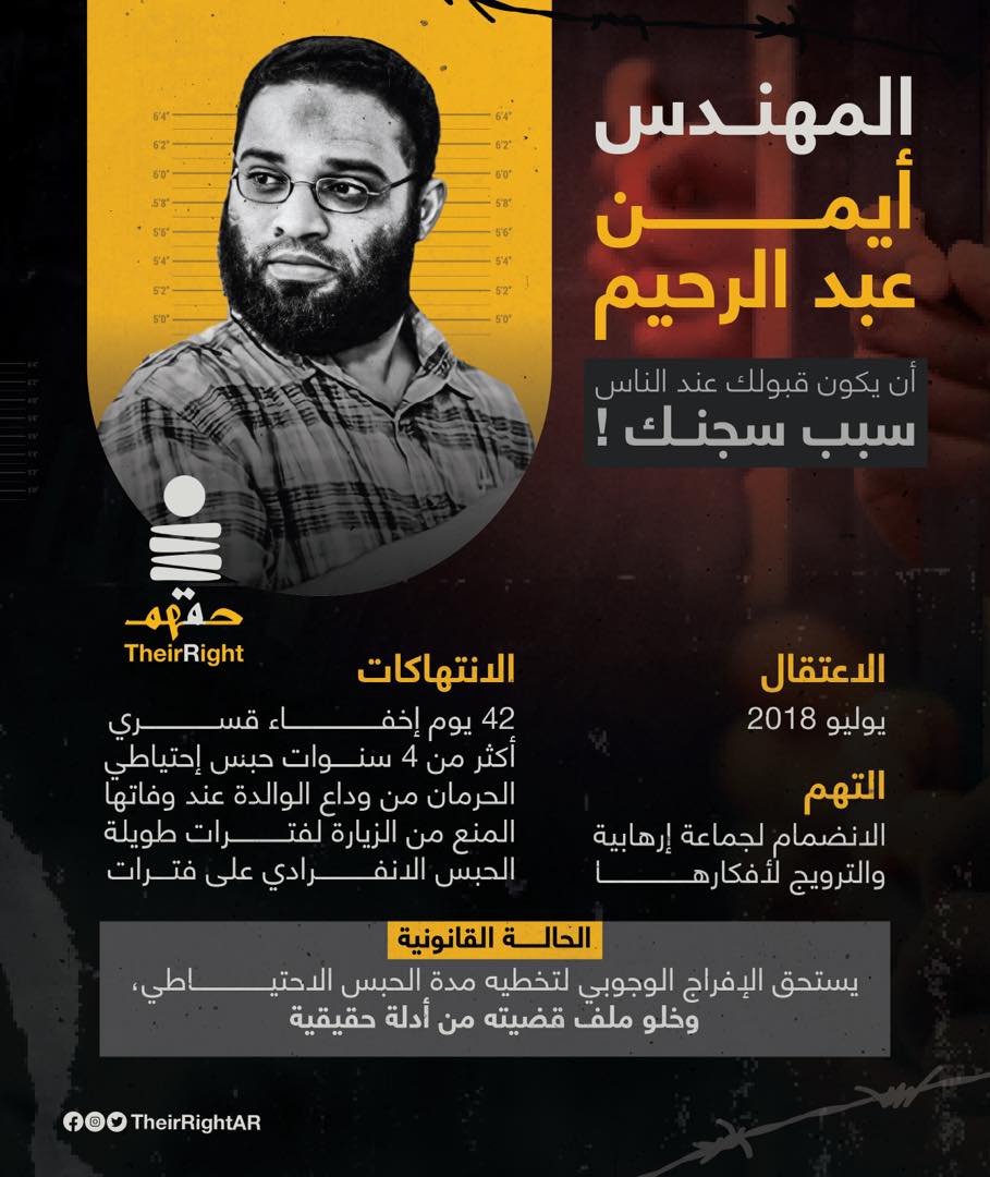 طالبت منظمة "حقهم "المختصة بالدفاع عن سجناء الرأي بالحرية للمهندس "أيمن عبدالرحيم" الذي يتواصل التنكيل به منذ اعتقاله في يوليو 2018 ويستحق الإفراج الوجوبي كونه تخطى مدة  الحبس الاحتياطي وخلو ملف قضيته من أدلة حقيقية .