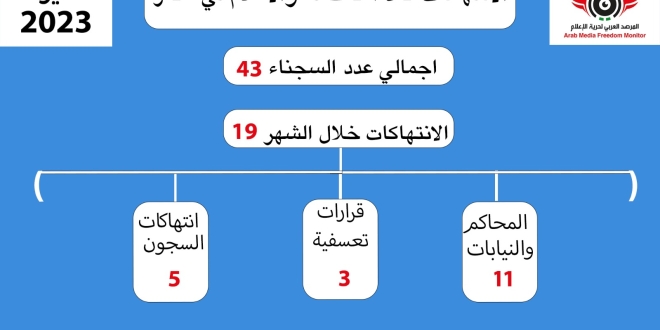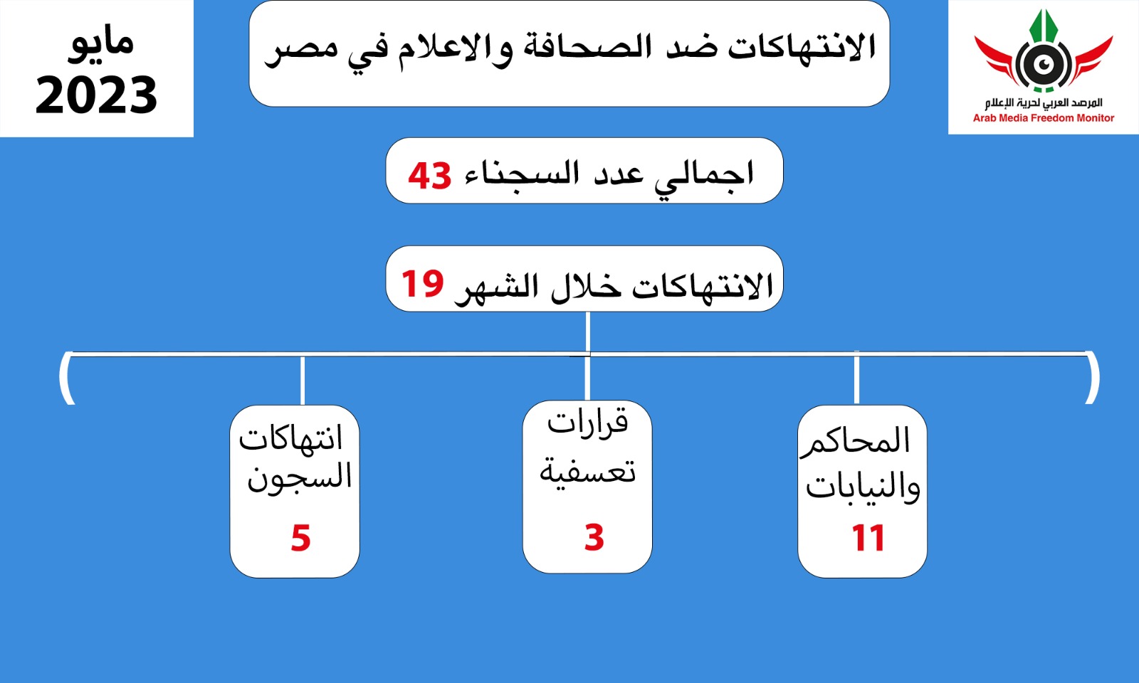 رصد المرصد العربي لحرية الإعلام في تقريره عن انتهاكات حرية الإعلام في مصر خلال شهر مايو المنقضي 19 انتهاكا تصدرها انتهاكات المحاكم والنيابات ب”11″ انتهاكا، وبلغت الانتهاكات بمقار الاحتجاز والسجون5 انتهاكات، فيما أماكن رصد 3 انتهاكات في باب القرارات الإدارية التعسفية، فيما ظل 43 صحفيا وإعلاميا خلف القضبان بنهاية الشهر.
