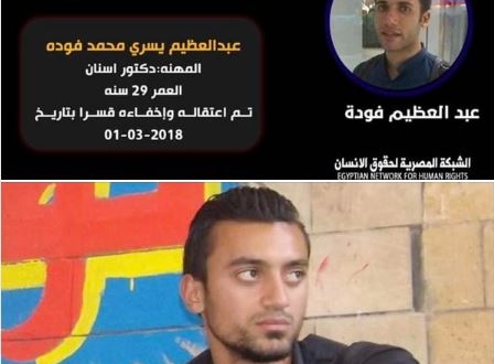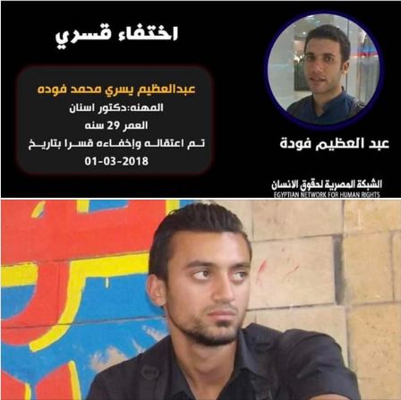 رصدت الشبكة المصرية لحقوق الإنسان ، استمرار نهج سلطات النظام الانقلابي في مصر ، باعتقال المواطنين وإخفاء الآلاف قسرا ، و الزج بهم على ذمة قضايا سياسية ،  وطالبت بالكشف عن مصيرطبيب الأسنان المختفي قسريا منذ أكثر من 5 سنوات ، عبد العظيم يسري محمد فودة  ، البالغ من العمر  31 عاما ، من مركز سمنود بمحافظة الغربية.