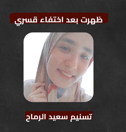 ظهرت بعد أسبوع من الاختفاء القسري المعتقلة " تسنيم سعيد إسماعيل الرماح "  23 عاما أثناء عرضها على نيابة الزقازيق الكلية بمحافظة الشرقية، بحسب ما كشف عنه أحد أعضاء هيئة الدفاع عن معتقلي الرأي .