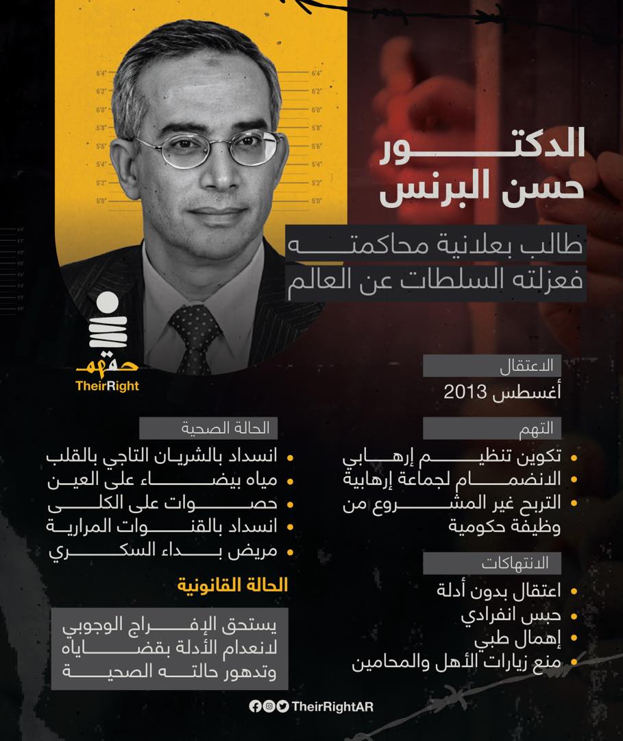 نددت منظمة "حقهم" المعنية بالدفاع عن سجناء الرأي بالانتهاكات التي يتعرض لها الدكتور "حسن البرنس" نائب محافظ الإسكندرية الأسبق ورئيس قسم الأشعة التخصصية بكلية الطب، والذي تشهد جوائزه العلمية بنبوغه، كما شهدت فترة توليه منصب نائب محافظ الإسكندرية نشاطا متميزا، وربما بسبب ذلك تنكل به سلطات النظام الانقلابي منذ اعتقاله قبل 10 سنوات.