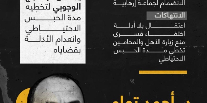 كما طالبت بمحاسبة المتورطين، فيما تعرض له من اعتقال تعسفي واختفاء قسري وانتهاكات متعددة داخل محبسه، دون أي سند قانوني منذ أن تم اعتقاله في يونيو 2020 بزعم نشر أخبار كاذبة والانضمام لجماعة محظورة.
