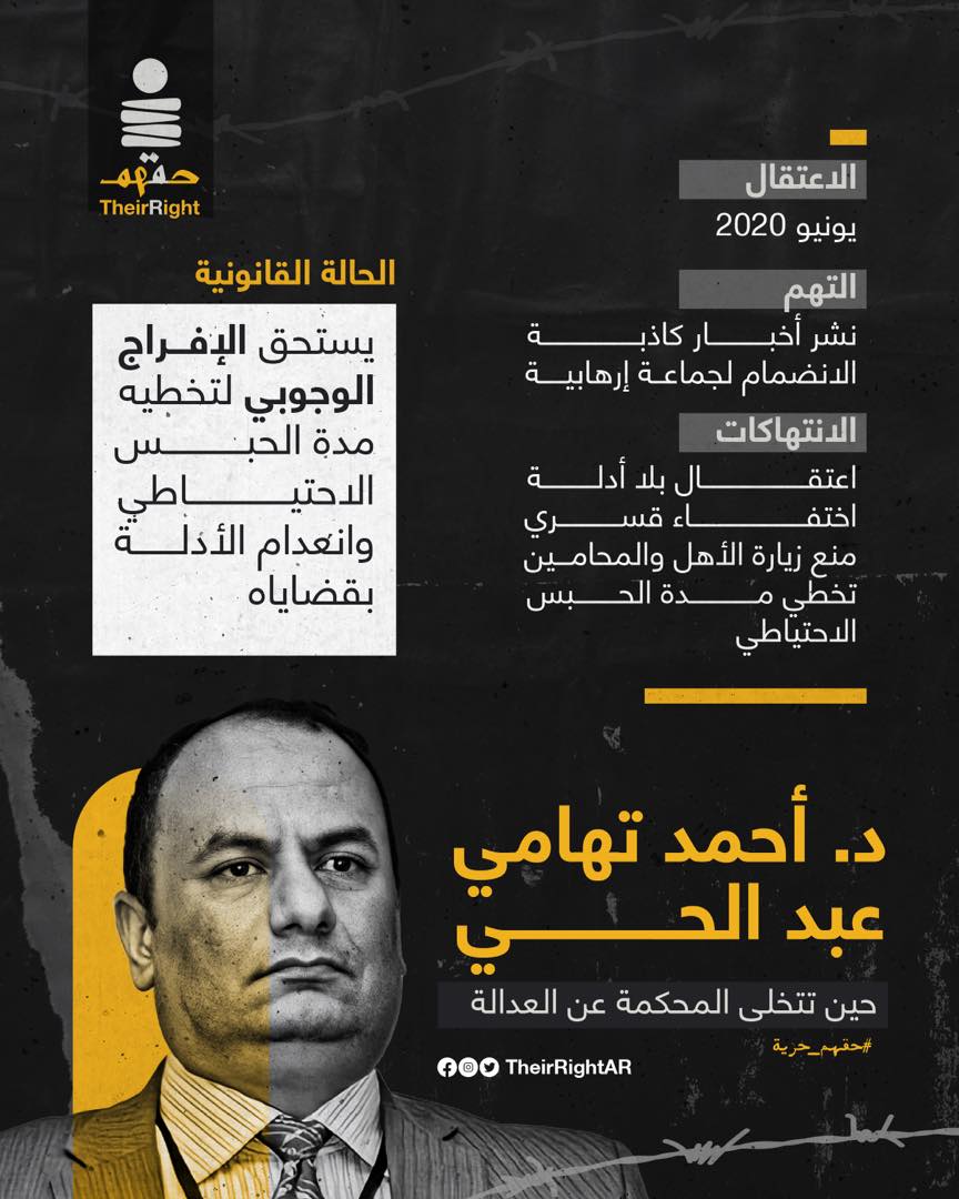 طالبت منظمة ـ حقهم ـ المختصة بالدفاع عن سجناء الرأي بالإفراج الفوري وغير المشروط عن الأكاديمي "أحمد تهامي عبد الحي" الذى يتواصل إضرابه عن الطعام لليوم الحادي عشر بعد إكماله 3 سنوات رهن الحبس الاحتياطي.