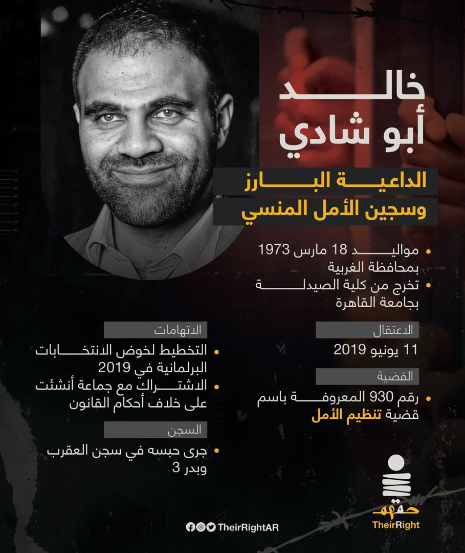 يشار إلى أن الداعية خالد أبو شادي تم اعتقاله منذ يونيو 2019 بعد خروجه و أداء صلاة العشاء بمسجد ”فاطمة الشربتلي” بالقاهرة وتعرّض للإخفاء القسري لنحو أسبوعين، قبل أن يظهر بنيابة الانقلاب العليا بالتجمع الخامس، حيث لُفقت له اتهامات ومزاعم فضفاضة لا يوجد عليها أي دليل، ولم تثبت حتى تاريخه على ذمة القضية الهزلية المعروفة إعلاميا بـ “خلية الأمل “.