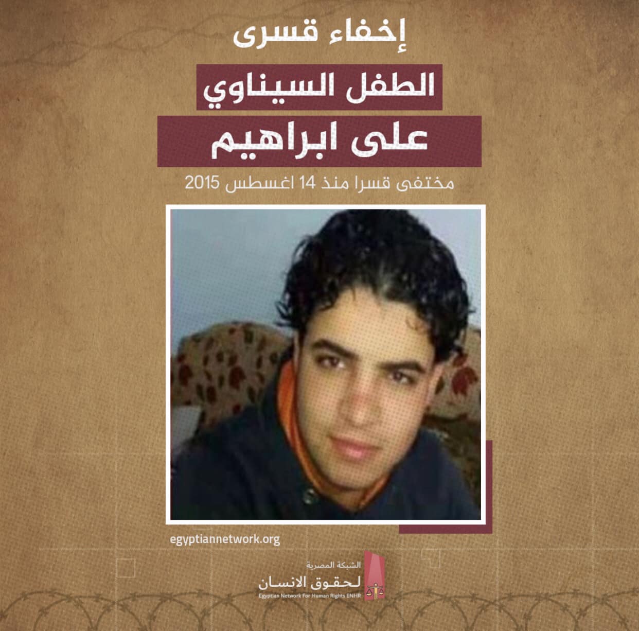 للعام الثامن على التوالي تواصل سلطات الانقلاب جريمة الإخفاء القسري لـ "علي إبراهيم سيد أحمد" الذي اعتقل منذ أن كان طفلا يبلغ من العمر 16 عاما وترفض سلطات النظام الانقلابي الكشف عن مكان احتجازه حتى الآن دون سند من القانون، بحسب ما وثقته منظمات حقوقية بينها الشبكة المصرية لحقوق الإنسان .
