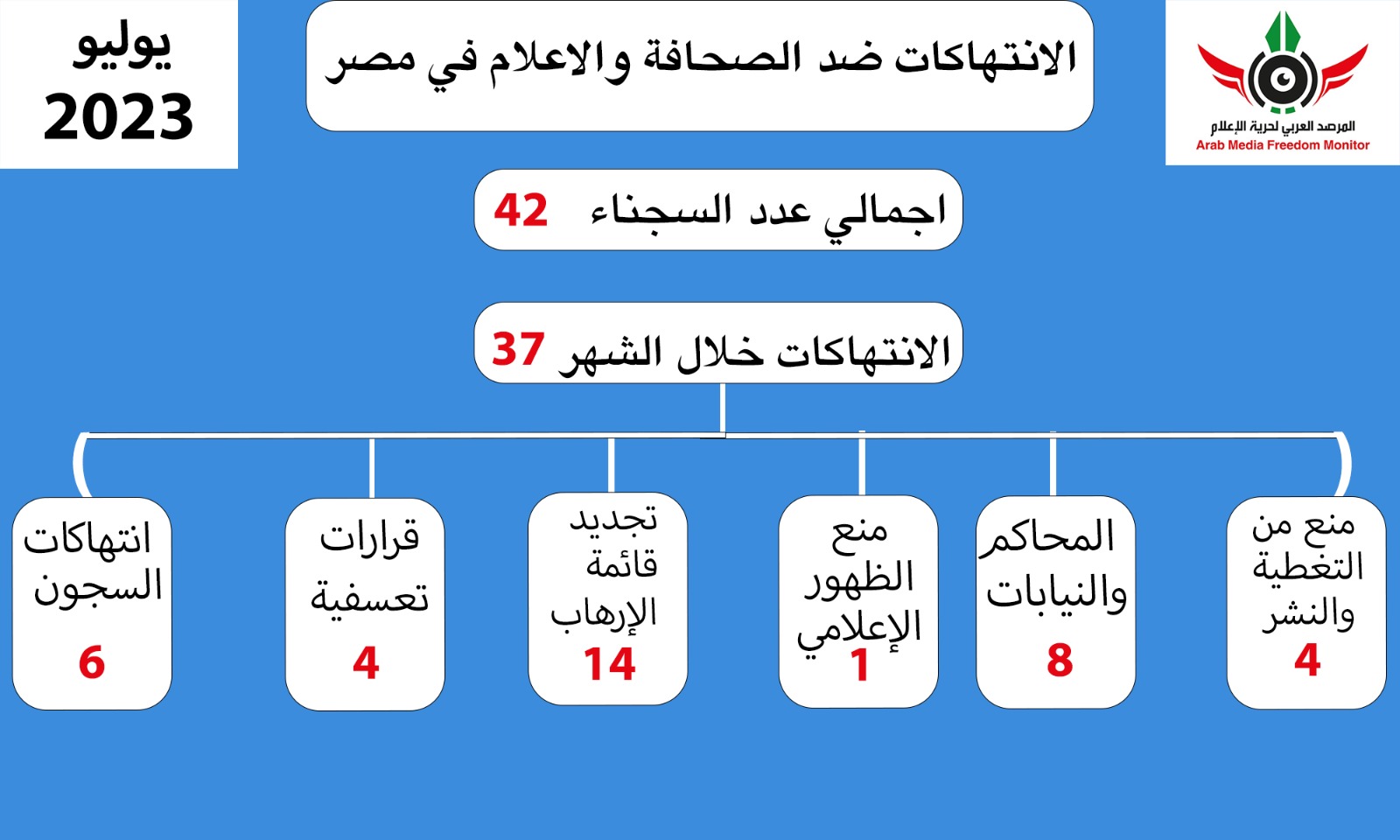 ووثق "المرصد" في تقريره الشهري عن انتهاكات حرية الإعلام في مصر لشهر يوليو المنقضي وفق ما أمكن رصده 37 انتهاكا ، تصدرها تجديد ما يسمى بقائمة الإرهاب بحق بعض الصحفيين والإعلاميين بالخارج ( 14 انتهاكا)، ثم انتهاكات المحاكم والنيابات "8" انتهاكات، وبلغت الانتهاكات بمقار الاحتجاز والسجون 6 انتهاكات، فيما رصد 4 انتهاكات في باب القرارات الإدارية التعسفية، مع 4 انتهاكات في منع النشر، وانتهاك وحيد في المنع من الظهور الإعلامي.