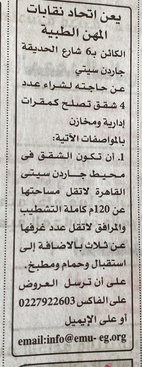 ونشر الدكتور إيهاب الطاهر منشورا على حسابه الشخصي بموقع التواصل فيس بوك، قال فيه: "نشرت جريدة الأهرام يوم الجمعة 25 أغسطس، إعلانا يفيد بأن اتحاد نقابات المهن الطبية يطلب شراء 4 شقق تصلح كمقرات إدارية ومخازن، على أن تكون بمحيط جاردن سيتي".