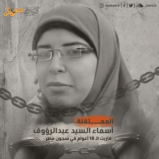 إلى ذلك طالبت منظمة "جوار" الحقوقية بالحرية للمعتقلة أسماء السيد عبد الرؤوف، التي قاربت العام الرابع في سجون الانقلاب، بعد اعتقالها من منزلها بمحافظة الشرقية يوم 9 فبراير 2020 على ذمة قضية ملفقة