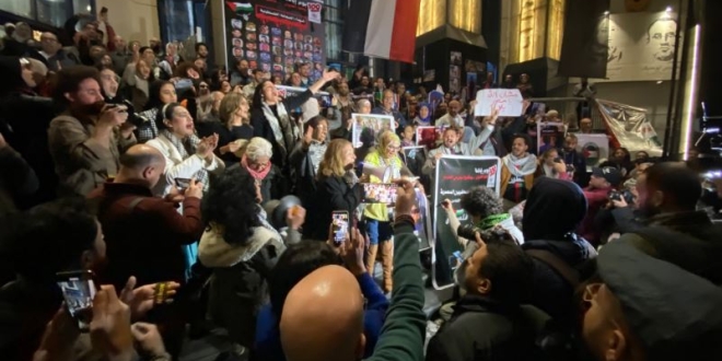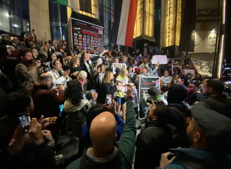 أعلن صحفيون ومحتجون متضامنون مع غزة أمام نقابة الصحفيين بالقاهرة توجيههم التحية لجنوب إفريقيا إشادة بموقفها من مقاضاة إسرائيل أمام محكمة العدل الدولية رافضين لدور حكام الخيانة في حصار غزة وهي الوقفة المواكبة لتصريح منسوب للسيسي قال فيه: “إلي فات كوم وإلي جاي كوم ثاني خالص، ومعبر رفح لم ولن يغلق”..