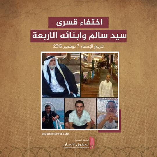 فبحسب شهادات شهود العيان والأسرة فللعام الثامن لازال مصيرهم مجهولا وذلك بعد أن قامت قوة مشتركة من الجيش والشرطة المصرية باعتقال المواطن السيناوى الحاج  سيد أحمد سالم وأربعة من أولاده تعسفيا .