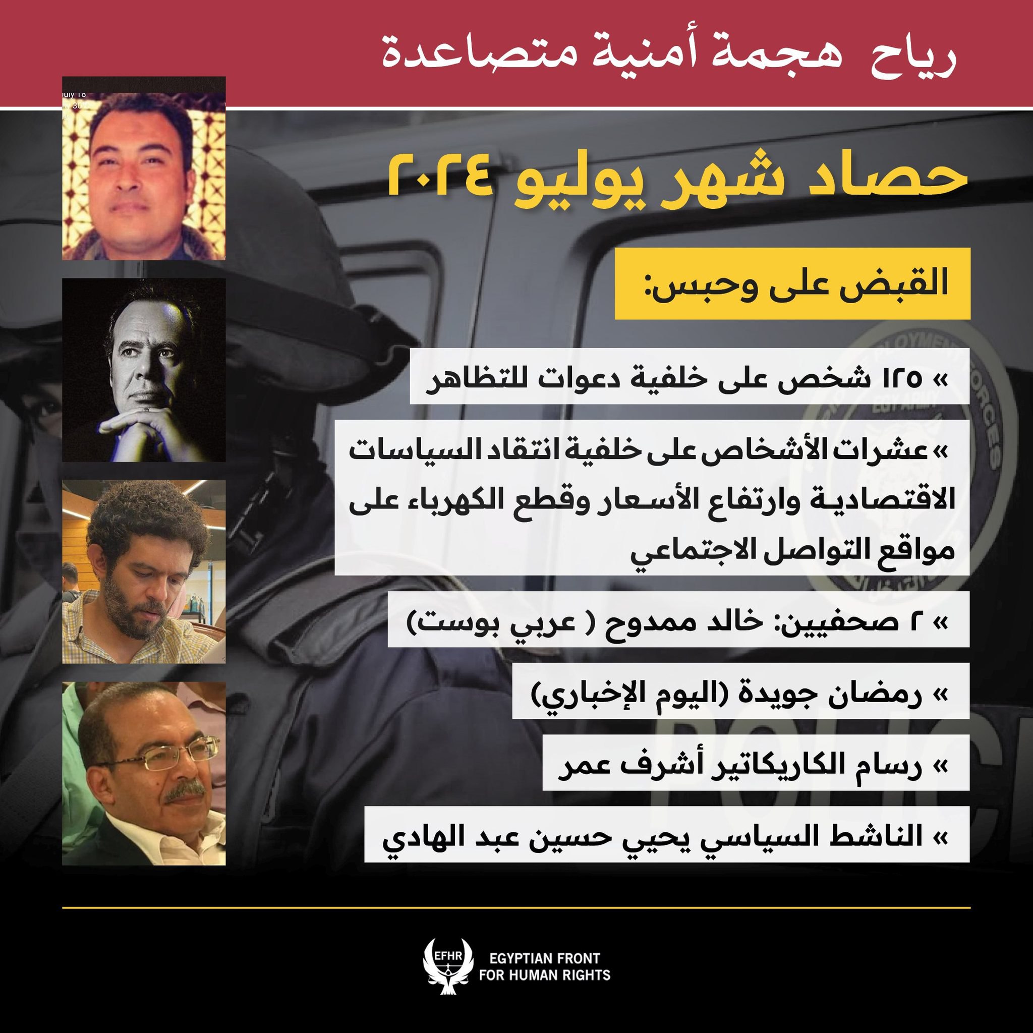 أصبحت سجون السيسي الوجهة النهائية لكل من يتحدث بما يُخالف سلطات الانقلاب أو يعارضها، كما أن الممارسات القمعية داخل السجون ومراكز الاحتجاز ما زلت مستمرة ولم تتغير، وفي ضوء ذلك رصدت الجبهة المصرية لحقوق الإنسان عبر بيان لها، اعتقال شرطة الانقلاب 125 مواطناً وحبسهم على ذمة قضايا سياسية خلال يوليو، على خلفية دعوات للتظاهر، من ضمنهم صحفيون ونشطاء وسياسيون.