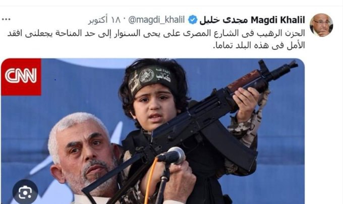 فغرد يحيى القزاز : “حجم الحزن الشديد على استشهاد يحيى السنوار الذي شاهده مجدي خليل في الشارع المصري، جعله يفقد الثقة فيه لتعاطفه مع المقاومة، ويعكس تغلغل الإيمان بالمقاومة والشعب الفلسطيني، وكراهية العدو الصهيوني وأعوانه، مصر عنوان المحطة التالية لانطلاق المقاومة، مصر بركان يغلي #المقاومة_هي_الحل”.