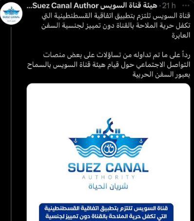 ومن غزة كتب الصحفي تامر @tamerqdh “يغرد أحدهم على تويتر أن مصر ملزمة دولياً بالسماح للجميع بالمرور عبر قناة السويس، سواء كانت القطع عسكرية أو مدنية.. ولكن السؤال هو: هل احترمت إسرائيل الاتفاقيات وتقيّدت بالالتزامات المتعلقة بمحور فيلادلفيا مع مصر ؟ .. أعتقد أن موقف الشعب المصري سمعناه جيداً في الفيديو، ولا يحتاج إلى كثير من الشروحات والتفسيرات.. لحظة عبور المدمرة الإسرائيلية “ساعر 5” قناة السويس”.