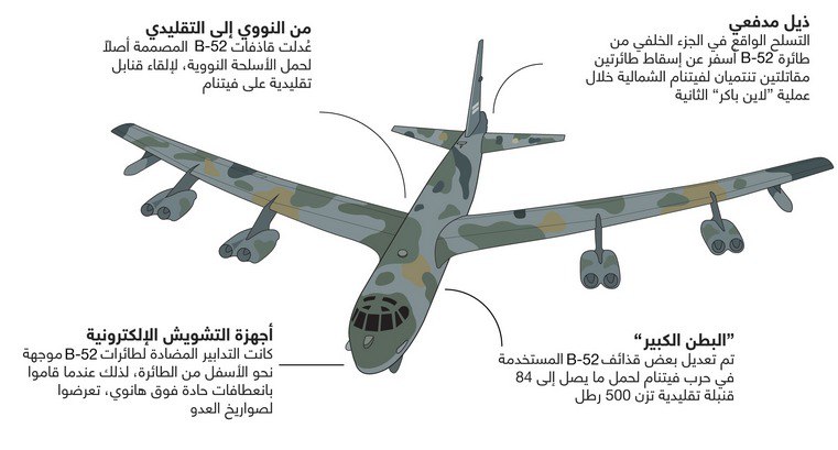وطائرات B52 “ستراتوفورتريس” ذات الثمانية محركات، والتي يمكن أن يحمل بعضها أكثر من 80 ألف رطل من الذخائر، لأول مرة في عام 1954 صُممت لتكون قاذفة عابرة للقارات يمكنها نقل حمولات نووية في أي مكان في العالم.