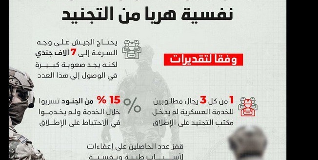 واستعرضت الصحيفة في تقريرها أزمة التجنيد في المجتمع الإسرائيلي والتسرب من الخدمة العسكرية والإعفاء من التجنيد لأسباب طبية ونفسية، وامتناع الحريديم عن الخدمة، إذ ادعى الجيش أنه كان يستطيع تجنيد 3 آلاف حريدي، ولكن في عام التجنيد السابق تم تجنيد 1200 فقط من أصل نحو 13 ألف مرشح للخدمة.
